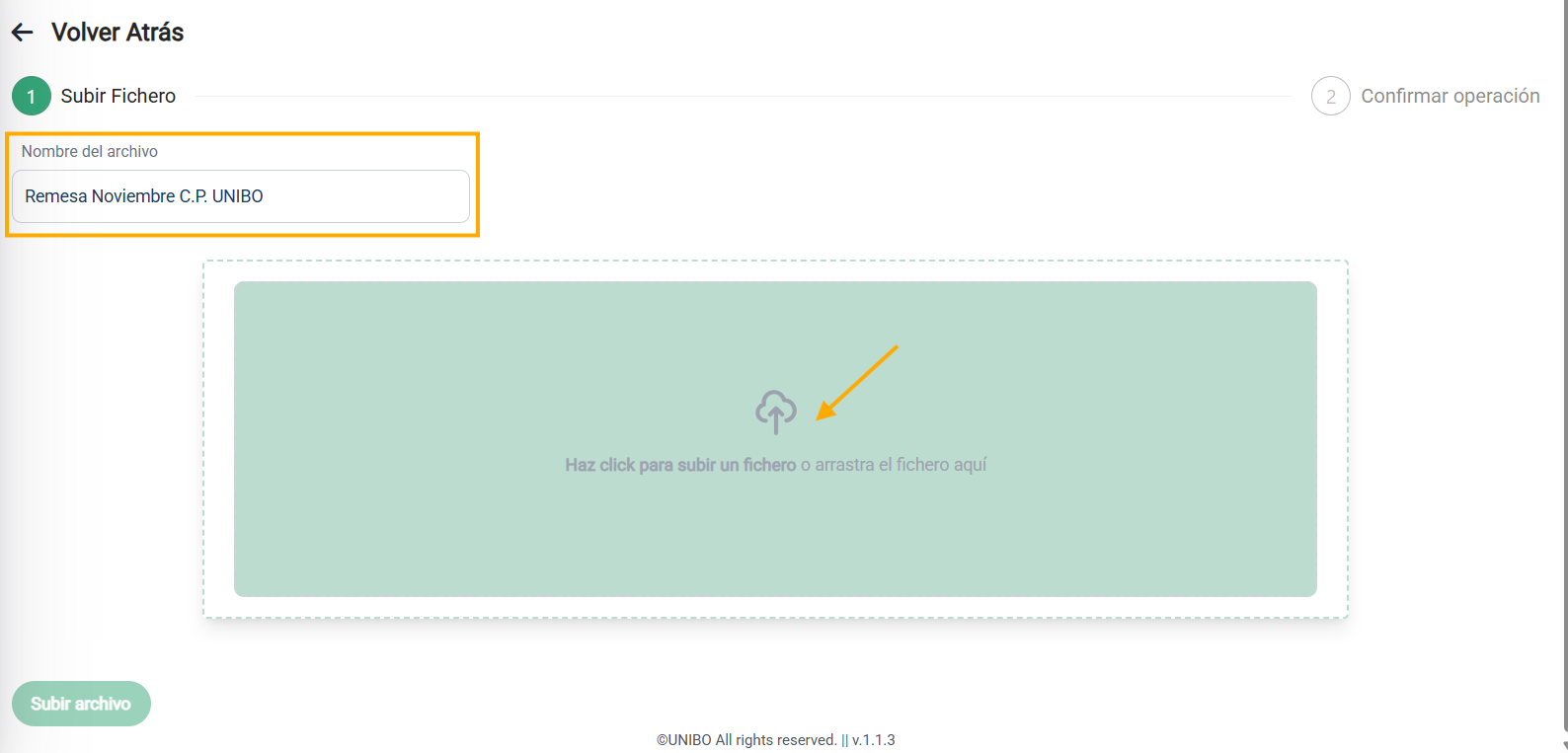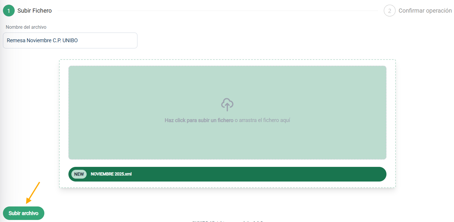 Nos pedirá un nombre del archivo. Aquí tenemos que poner una descripción para esta remesa, la que nosotros consideremos y nos ayude a diferenciarla, por ejemplo, "Remesa Noviembre C.P. UNIBO". Luego pulsaremos en el centro para buscar nuestro fichero o bien, lo arrastraremos directamente desde el directorio donde esté y lo soltaremos en el recuadro del centro.