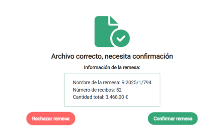Si el archivo es correcto, nos dará dos opciones: Rechazar remesa o Confirmar remesa. Debemos confirmar si queremos que termine de tramitarse.