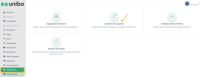 Una vez hayamos accedido, en el menú lateral izquierdo, nos situaremos en la opción Configuración. Dentro de configuración, pulsaremos en Gestión de usuarios: