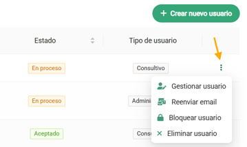 Debemos tener en cuenta que la opción Gestionar usuario y Reenviar email, solo estarán disponibles para usuarios en estado "En proceso" y no se visualizarán en usuarios que ya están en estado Aceptado y la opción Gestionar documentación, solo estará disponible para el alta de usuarios administradores en estado "En proceso".