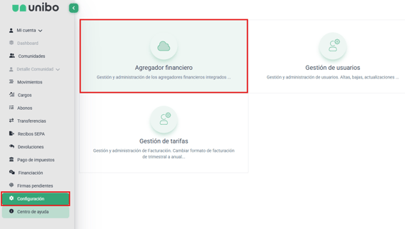 En el portal Unibo, ve al menú lateral izquierdo Configuración y luego pulsa en Agregador Financiero: