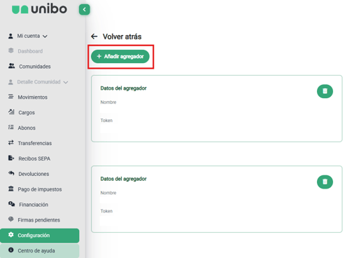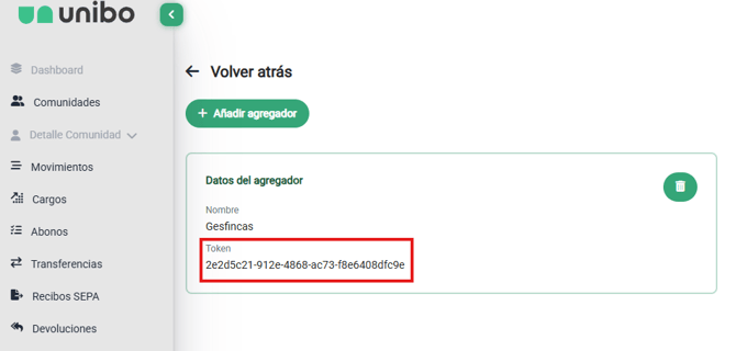 Si todo ha ido bien, mostrará un mensaje de confirmación y al volver a la pantalla anterior, podremos ver la ficha del agregador. En esta ficha, veremos un Token. Este token, debemos copiarlo en Gesfincas: