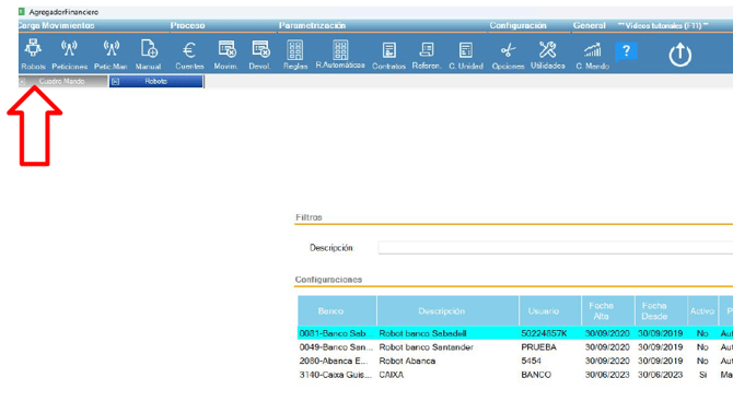 En nuestra aplicación de Gesfincas, en el Agregador Financiero, pulsaremos en la opción "Robots":