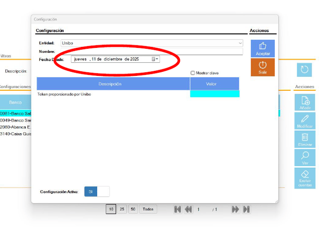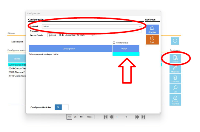 Pulsaremos en Añadir en el menú de la derecha, seleccionaremos la entidad Unibo y en Valor, pegaremos el Token que hemos copiado anteriormente.