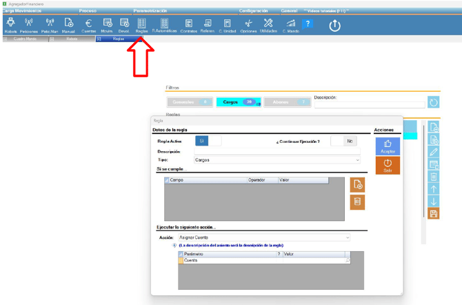 Y en el menú superior Reglas, estableceremos las que sean necesarias para automatizar la contabilización: